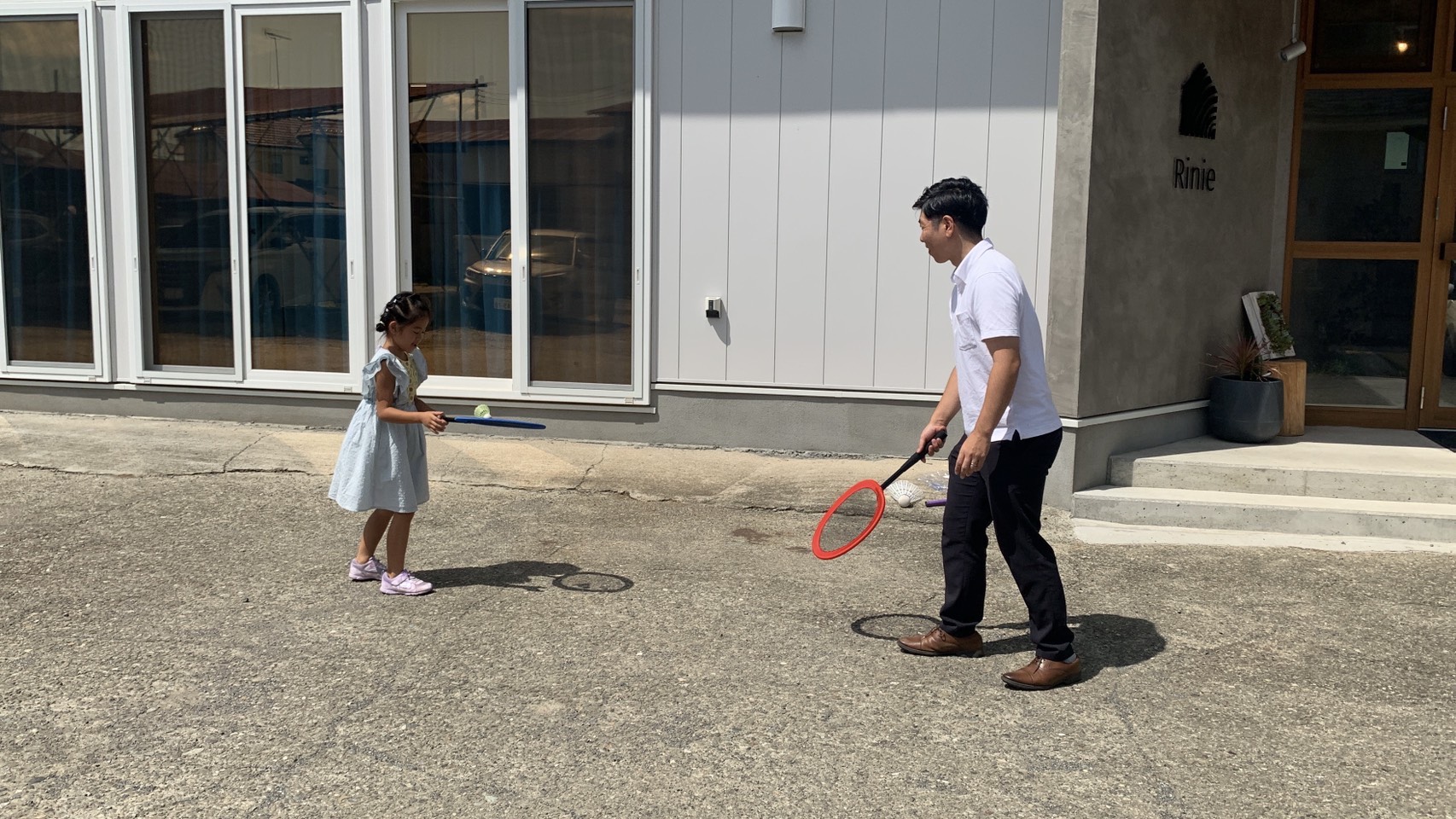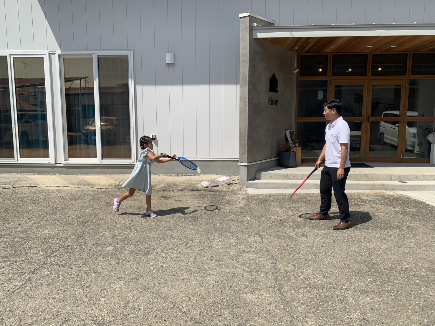 私に挑戦したい方は、大人・子供問わず打合せ後にバドミントンやりましょう!