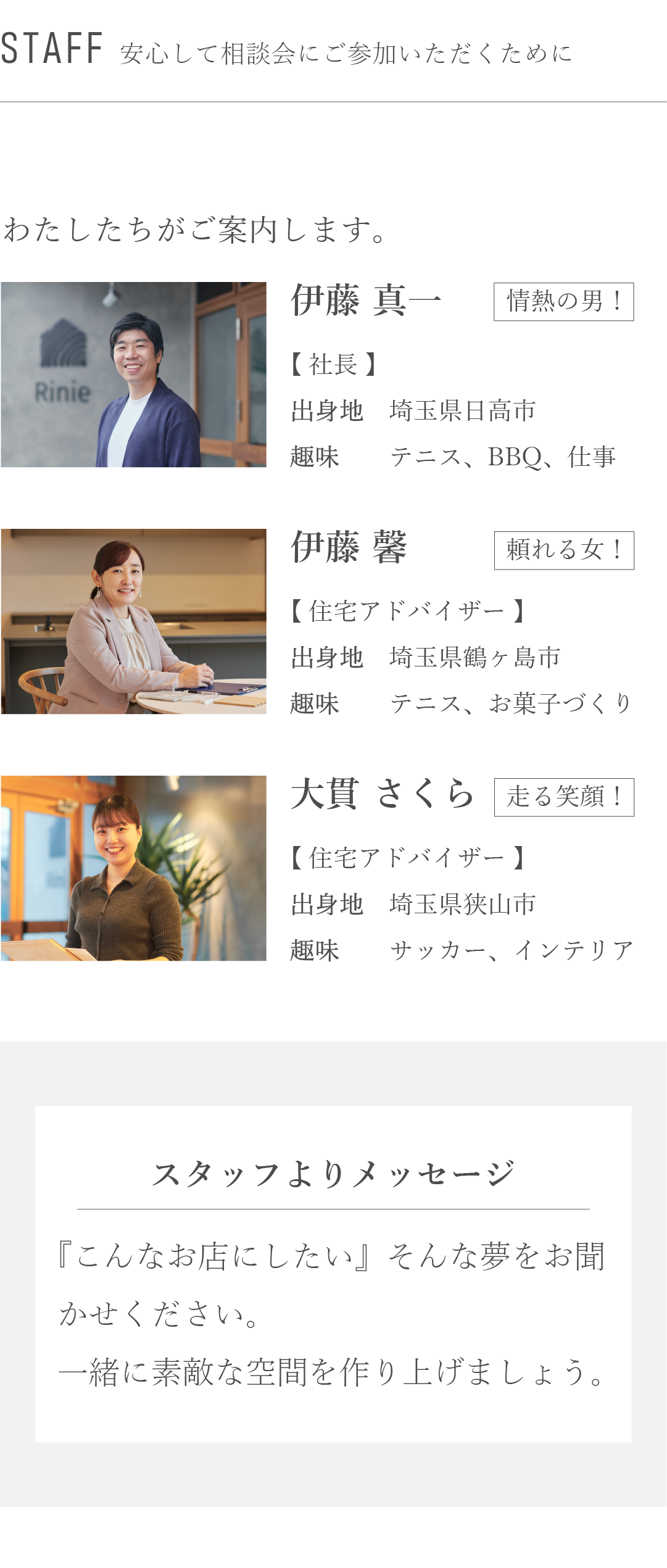 ホーム イベント報告 店舗新築改装相談会 ◆終了しました 店舗新築改装相談会 日時:2025年10月9日(木)・10日(金) ①10:00~ ②13:00~ ③15:00~場所:埼玉県日高市北平沢646(Rinie新スタジオ) お申し込み ご予約はコチラ ご予約はコチラ ご予約はコチラ ご予約はコチラ ご予約はコチラ ご予約状況 【10/9・木曜日】 ①10:00〜 ②13:00〜 ③15:00〜 【10/10・金曜日】 ①10:00〜 ②13:00〜 ③15:00〜 ご予約はコチラ