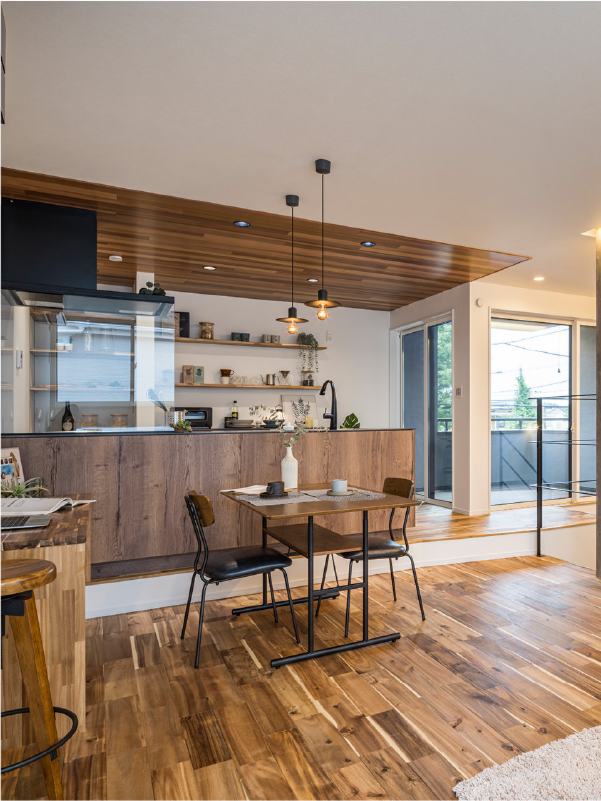 キッチンに立ちながら、LDK全体をパノラマで見渡せる安心の間取り。家族の何気ない笑顔や、遊んでいるお子様の様子を常に見守れる「住まいの特等席」です。ダイニング横の造作デスクは、在宅ワークはもちろん、お子様の学習を見守るスタディースペースとしても最適です。