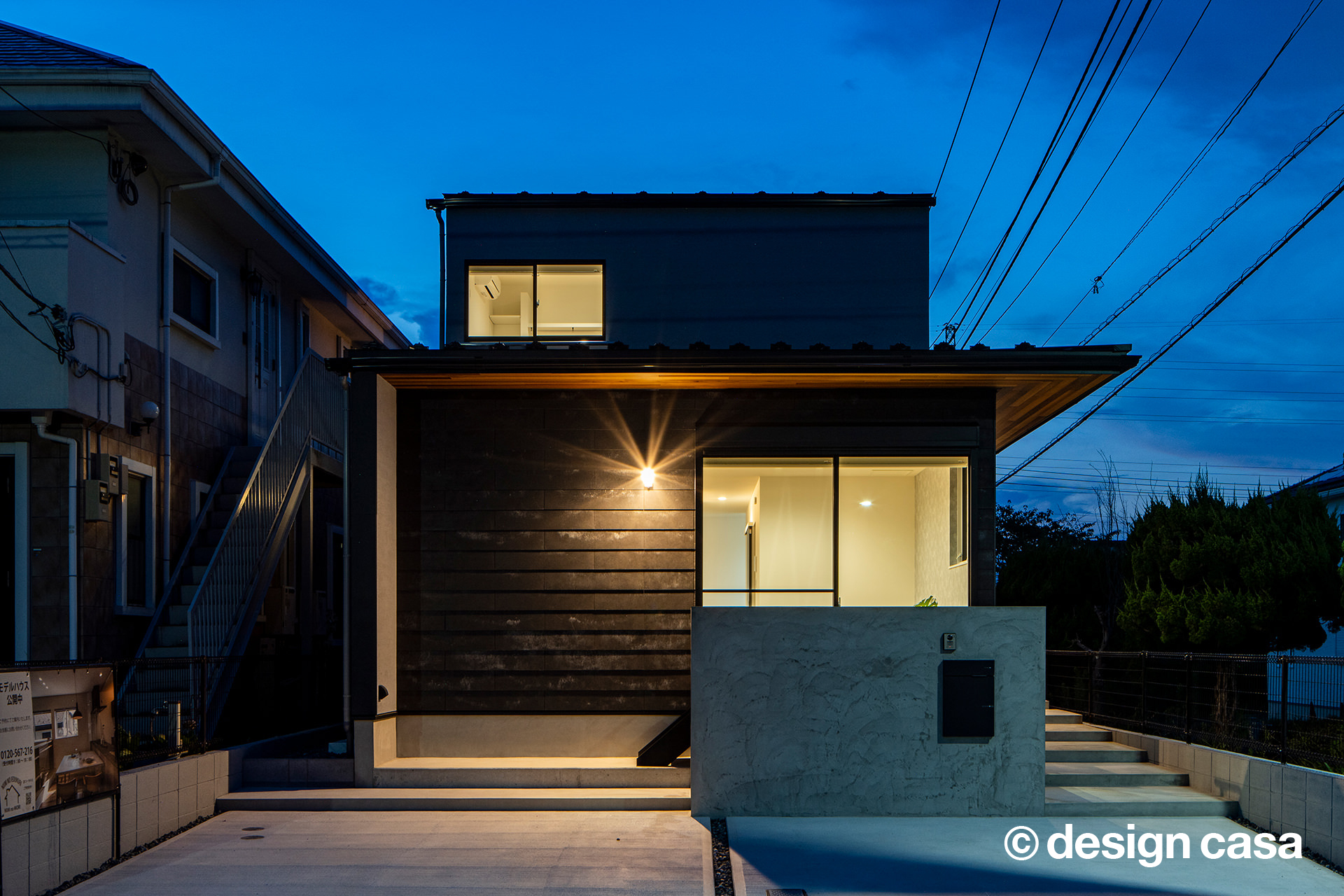 日差しや雨を遮る軒下が、家族のセカンドリビングに。玄関へと続くゆるやかな階段アプローチは、ベビーカーが余裕を持って通れるワイドな階段幅にこだわり、日々の外出をスマートに支えます。