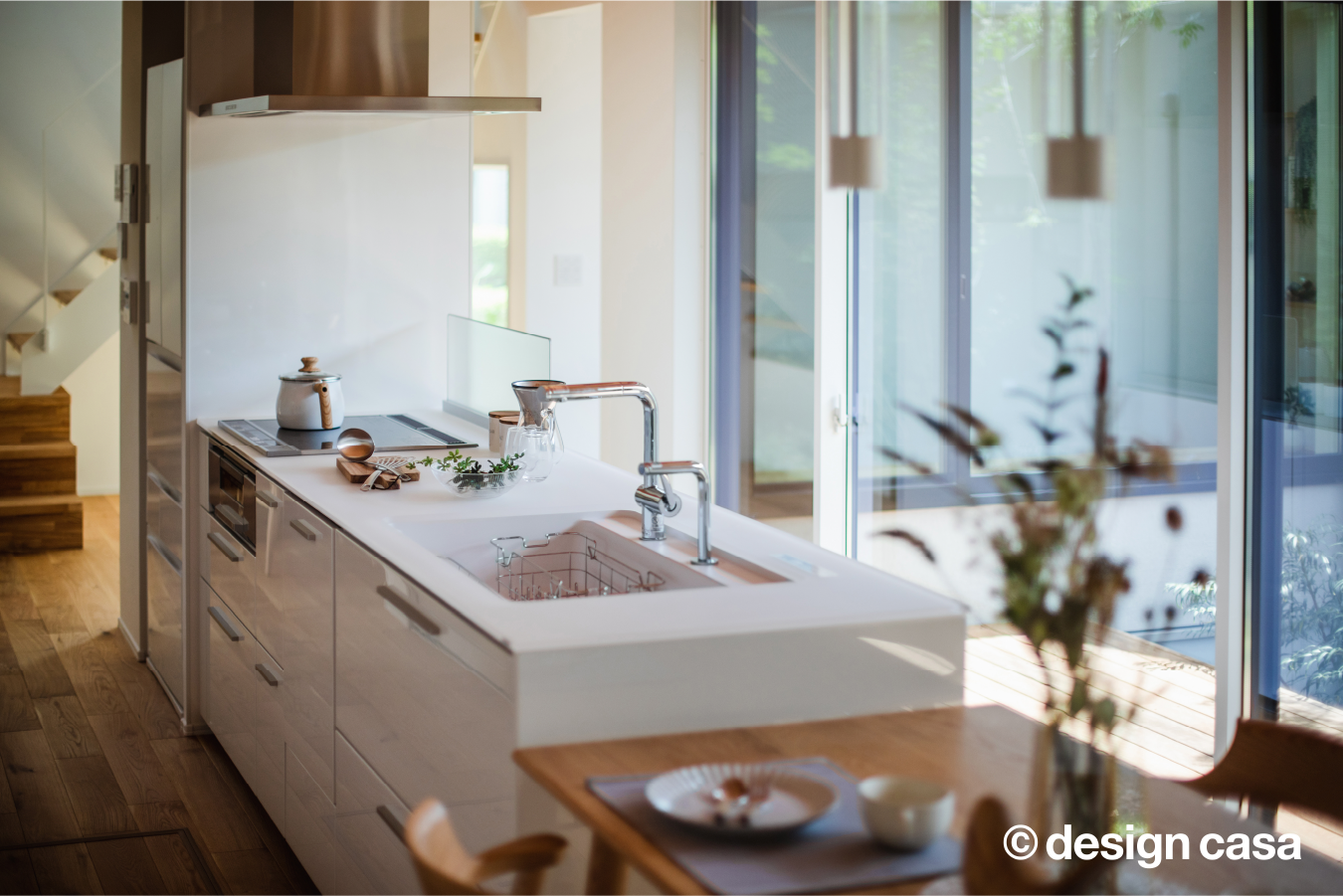 ダイニング、キッチンは横並びとなっており、配膳や片付けがスムーズに行えます。アイランドキッチンは窓先の開けた視界のおかげで閉塞感が感じられない上、家族とのコミュニケーションを取りながら作業を進めることができ、作業時間も無駄にすることがありません。