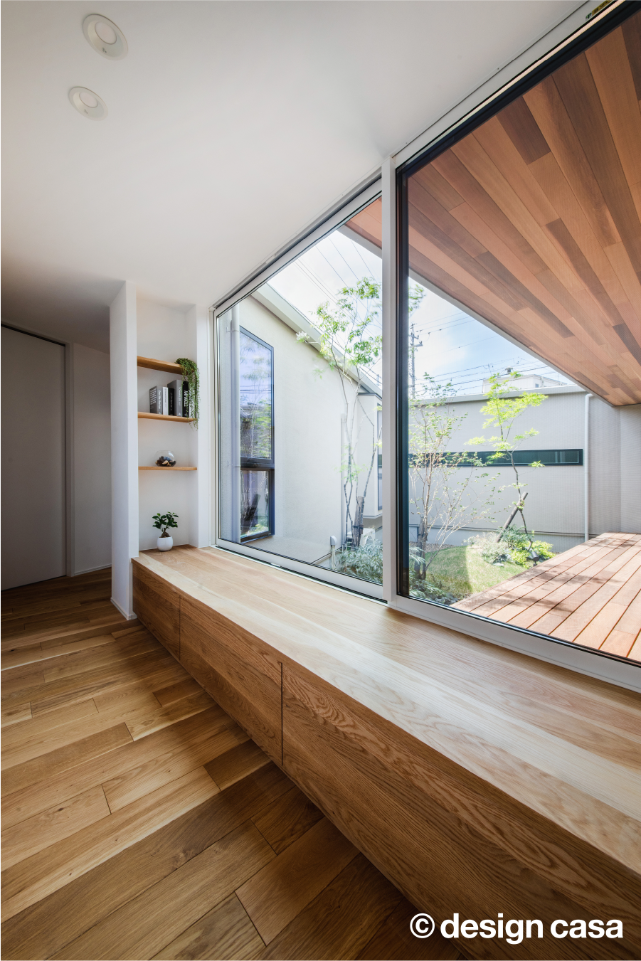 ヌックとは、「こぢんまりとして居心地のよい空間」のこと。 スコットランド語の「neuk(ヌーク)」が語源と言われており、「温かくて心地のよい場所」という意味もあります。中庭を囲む廊下には収納付きのベンチを設けており、風景と構造を有効活用したちょっとした憩いのスペースに。
