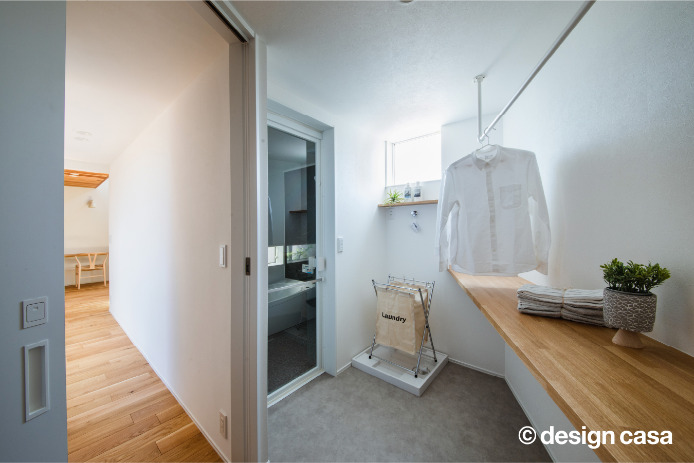 洗濯や入浴など何かと手が塞がりがちなシーンが多いバスルームには、幅のあるカウンターと物干しポールを設けることで限られた空間ながら利便性をアップさせています。