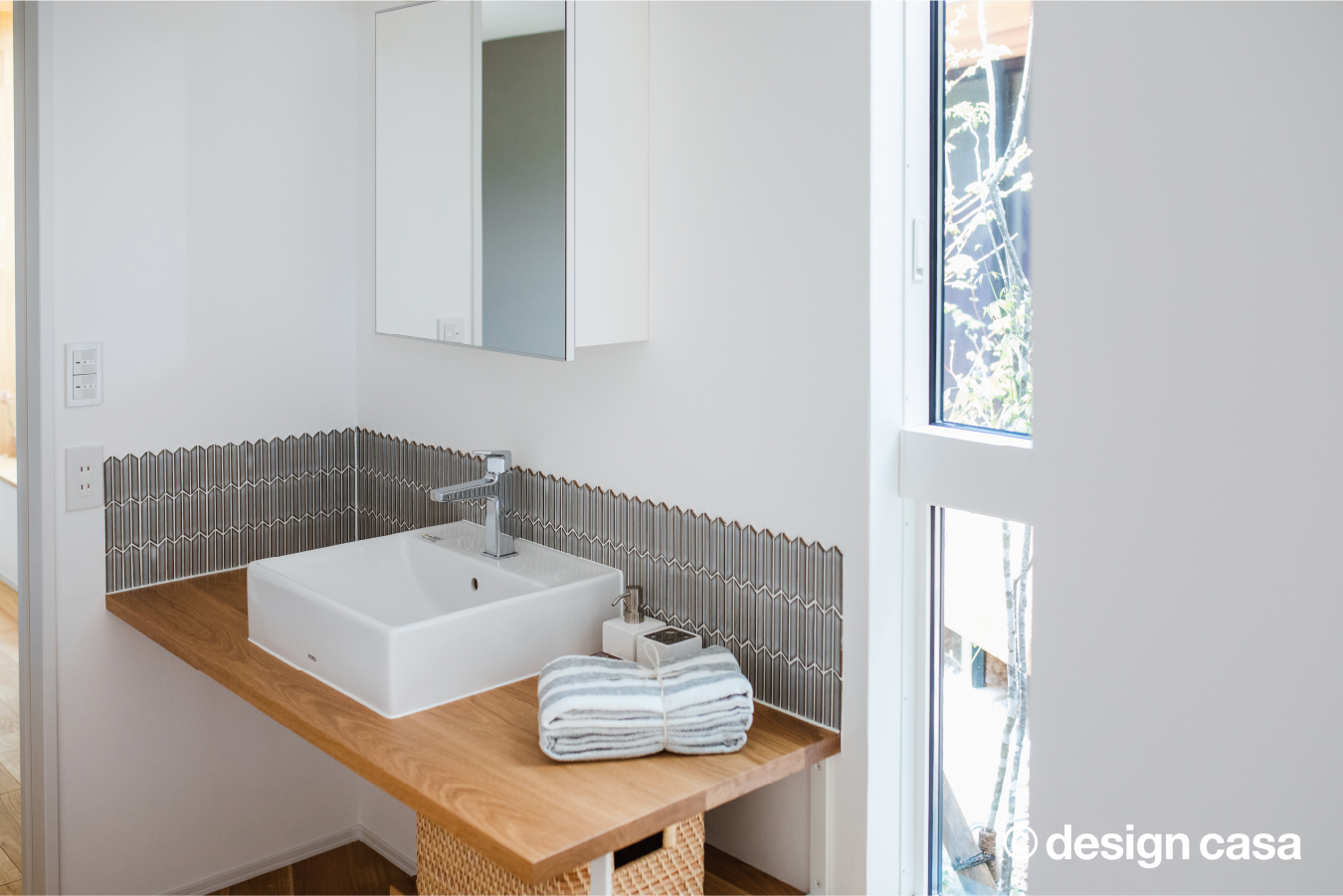 洗面スペースは、自然光がたっぷり差し込む窓と、温かみのある木目カウンター。