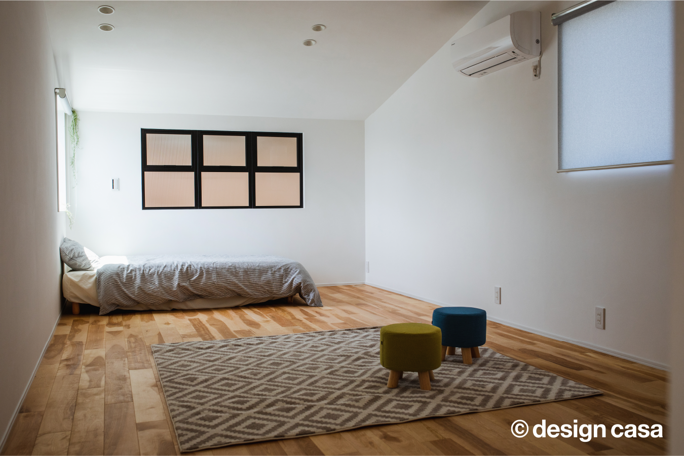 2階はロフトのような作りでLDKの上部に当たるスペースに子供部屋が2つ設けられており、高さを利用しながら吹抜天井を有効利用しています。