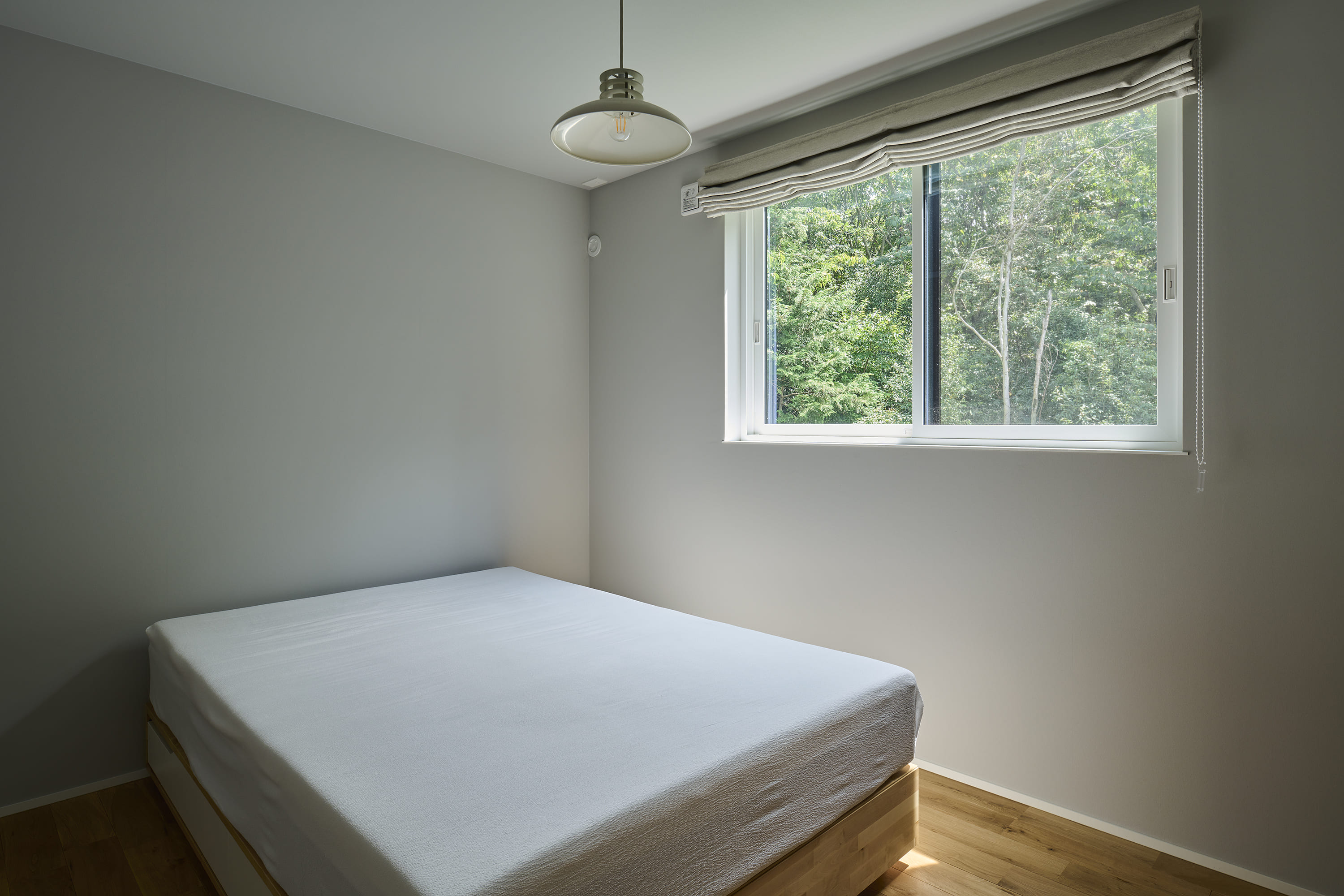 壁面には光を柔らかく受け止める、質感豊かなグレーの壁紙を選びました。 大きな窓から見える森の深緑と、グレーの壁が織りなすコントラストは、まるで森の中に静かに佇むホテルのよう。